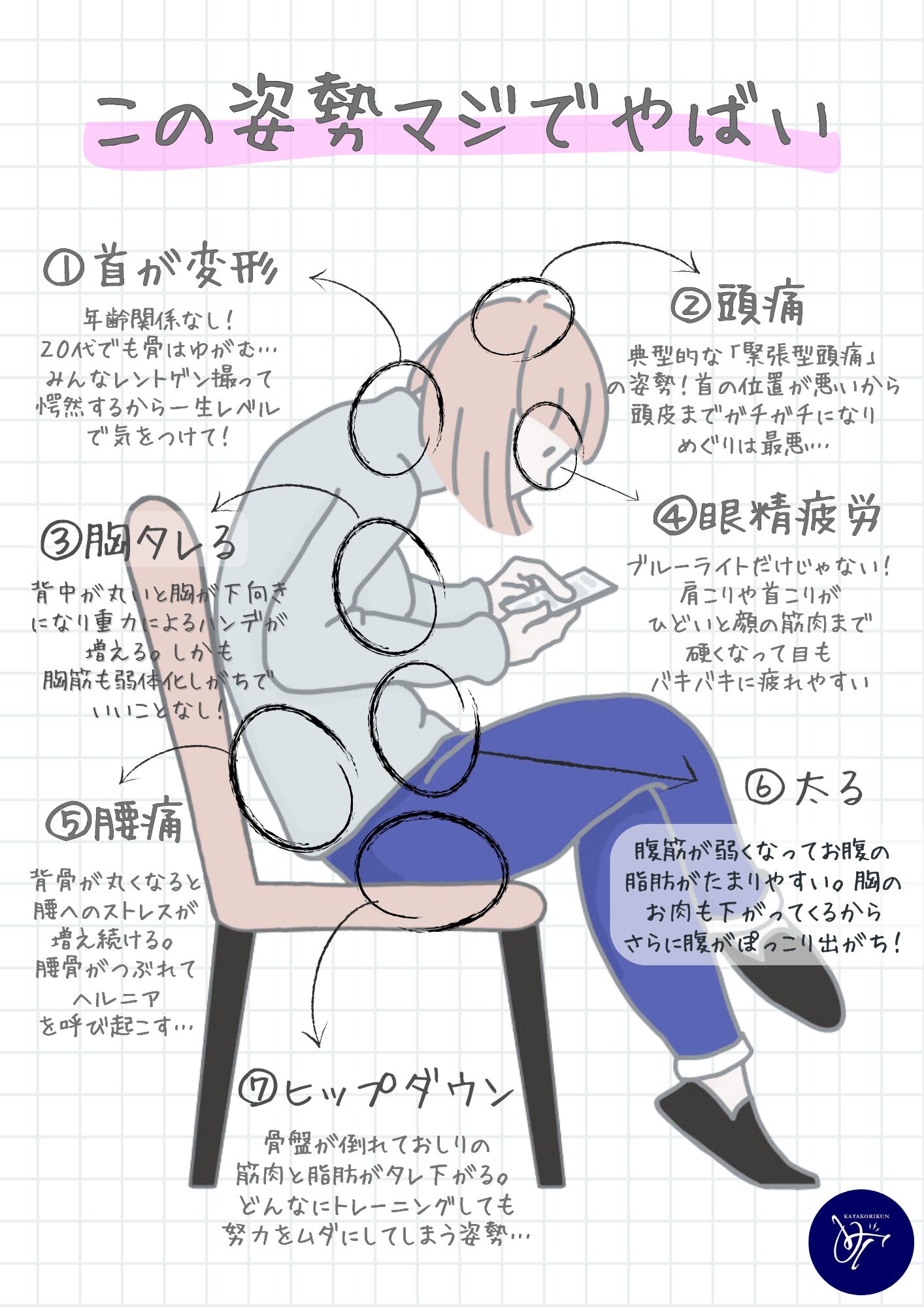 現代人の8割がこの「スマホ姿勢」になっていると言っても過言ではない。スマホをみる姿勢改善の必要性を知り、正しい姿勢を身につける習慣と意識をもちましょう!。
