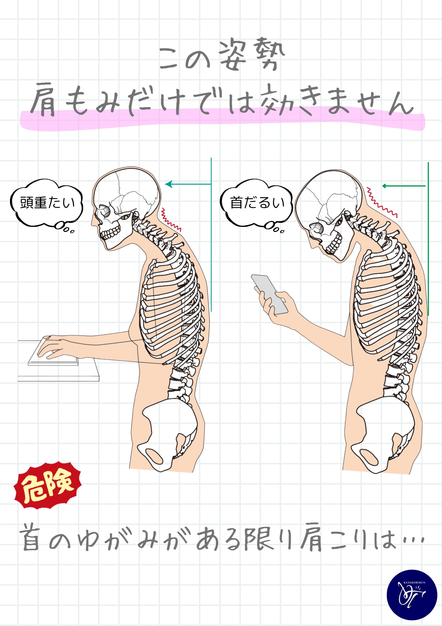 姿勢が悪くて肩こりに悩む人は、マッサージを受けて「気持ちいい」で終わる人が多すぎます。しかし、肩こりを改善するには、【姿勢の改善】【運動】【筋トレ】が必要不可欠です!そのための注意喚起としての図解です。