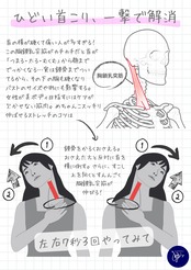 首こりに悩む人の8割が胸鎖乳突筋(きょうさにゅうとつきん)が硬くなっています。呼吸を止めることなく、無理のない範囲でストレッチしてみてください。痛みや痺れが悪化する人は絶対に無理をせず、ご相談ください。
