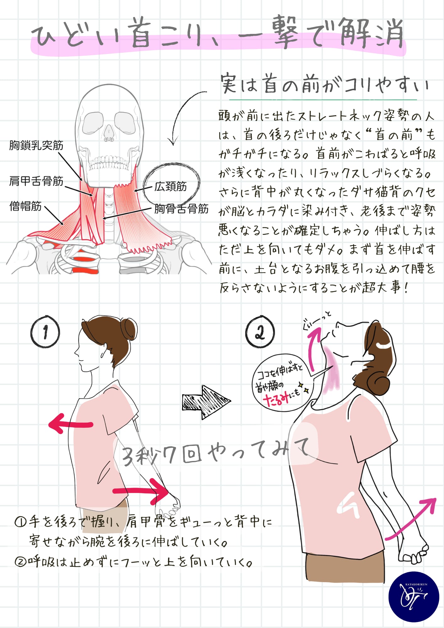 猫背やストレートネックなど頭が前に出た姿勢は、肩の後ろだけじゃなく首の前まで硬くなりやすい。さらに肩甲骨の動きまで弱くなる。硬さと弱さは、姿勢の悪さや肩こり、首こりを悪化させる。今すぐ図解を見ながら運動してみて。
