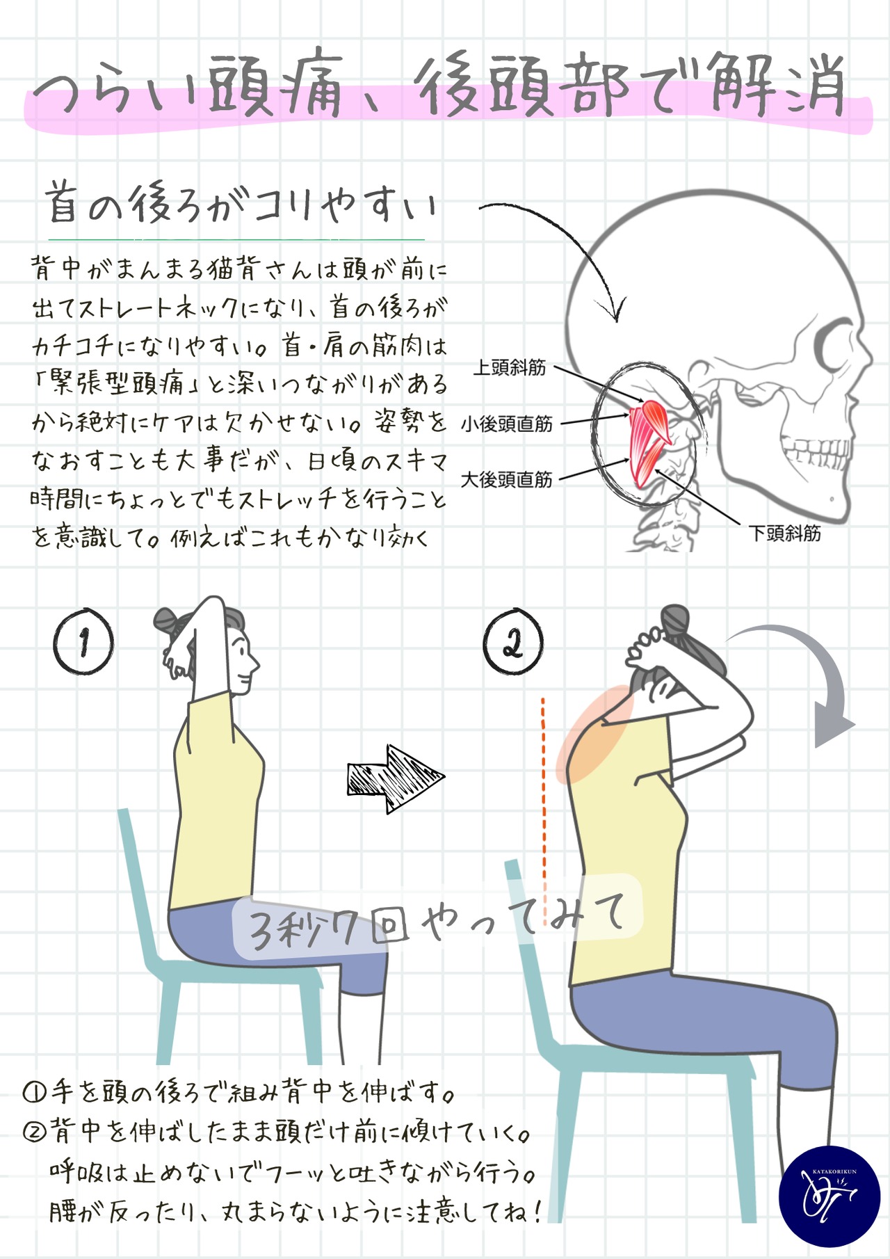 肩こりや首こりがひどい人は、後頭部から首の後ろまでガチガチに固まりやすい。首の後ろが固まると首が動きにくくなり、「つまる」を感じる人が多い。今すぐ図解を見ながらストレッチしてみて。ポイントは、座ってる姿勢をまっすぐにして行うこと。