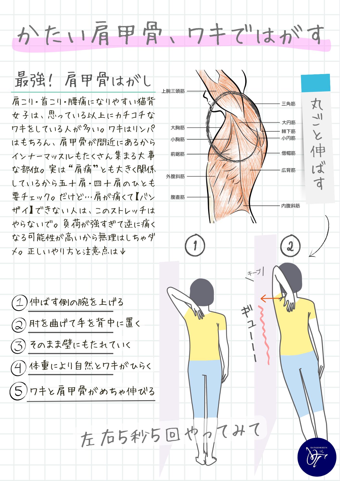 肩こりや首こりがひどい人は、肩甲骨やワキまで硬い人がかなり多い。壁を使うと、今まで動かさなかった部位まですんごく伸びる。肩痛のある人はやり過ぎ注意!図解を見ながら、無理のない範囲でやってみて。