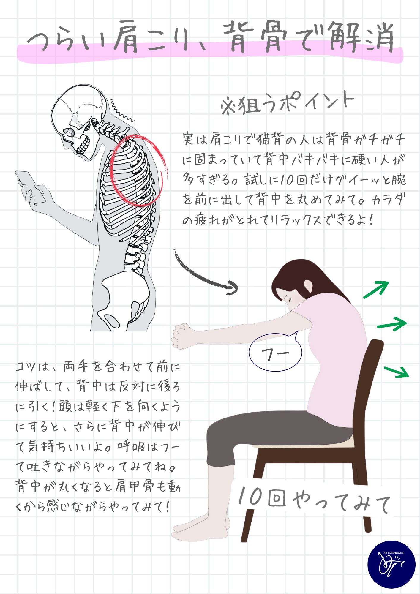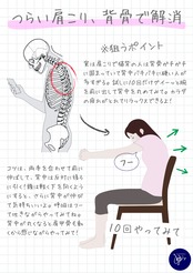 姿勢が悪い人は背中が丸くなり、硬くもなりやすい。一度図解の通りに呼吸をしながら、からだを伸ばしてみて。思っている以上にスッキリするから、1日1回はおすすめです。