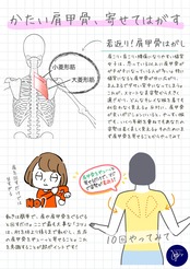 肩こりや首こりがひどい人は、背中や肩甲骨がガチガチに固まりやすい。肩甲骨がこわばると肩関節や首の動きにも制限が生じやすい。特に肩甲骨を背中で寄せる動きは、日常生活ではかなり少なく弱くなりやすい。ぜひ、今すぐ図解を見ながらエクササイズをやってみて。